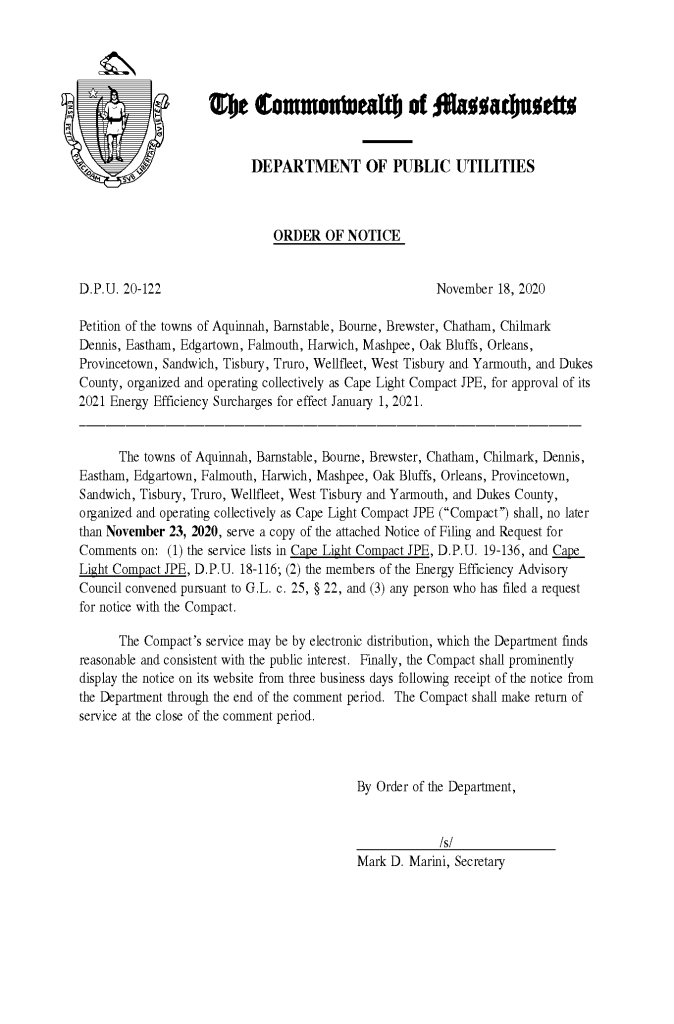 The Department of Public Utilities will accept written comments on the Compact’s proposed 2021 EES. Any person interested in commenting on this matter may submit written comments no later than the close of business (5:00 p.m.) on December 9, 2020. All comments must be submitted to the Department in pdf format by e-mail attachment to peter.ray@mass.gov and krista.hawley@mass.gov. The text of the e-mail must specify: (1) the docket number of the proceeding (D.P.U. 20-122) (2) the name of the person or company submitting the filing; and (3) a brief descriptive title of the document. In addition, written comments should be sent to the Compact’s attorneys, Jeffrey Bernstein, Esq. at jbernstein@bck.com, and Audrey Eidelman, Esq. at aeidelman@bck.com