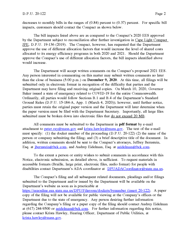 The Department of Public Utilities will accept written comments on the Compact’s proposed 2021 EES. Any person interested in commenting on this matter may submit written comments no later than the close of business (5:00 p.m.) on December 9, 2020. All comments must be submitted to the Department in pdf format by e-mail attachment to peter.ray@mass.gov and krista.hawley@mass.gov. The text of the e-mail must specify: (1) the docket number of the proceeding (D.P.U. 20-122) (2) the name of the person or company submitting the filing; and (3) a brief descriptive title of the document. In addition, written comments should be sent to the Compact’s attorneys, Jeffrey Bernstein, Esq. at jbernstein@bck.com, and Audrey Eidelman, Esq. at aeidelman@bck.com